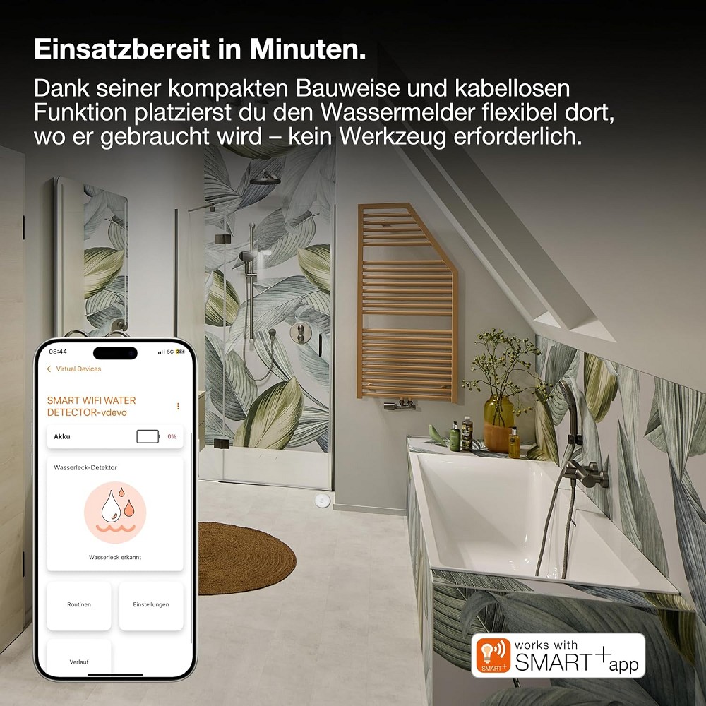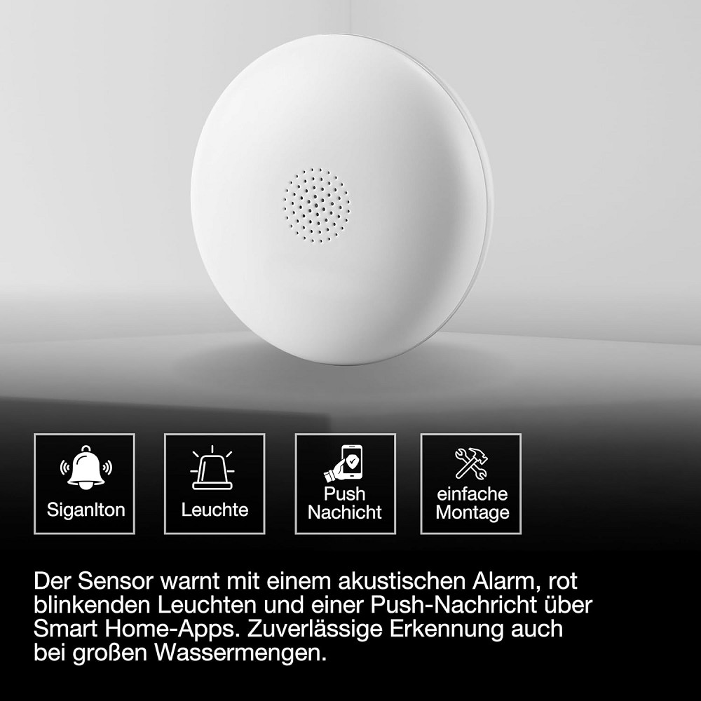 SMART+ Sensor zur Wassererkennung mit WiFi-Technologie. Produkteigenschaften: Kompatibel mit Google Home. Netzwerkprotokoll: WiFi (2,4 GHz). Steuerbar mit der SMART+ App (mit Minimum Android 8.0 oder iOS 14.0). Produktvorteile: Dreifach-Alarmfunktion mit lautem akustischem Alarm (>75 dB), rot blinkenden Warnleuchten und Push-Benachrichtigung über Smart Home-Apps. Funktioniert zuverlässig auch bei großen Wasserlecks, da IP65 wassergeschützt . Führt einen regelmäßigen Selbsttest durch, überprüft den Batteriestatus und die Wi-Fi-Verbindung und meldet Probleme sofort. Lange Batterielebensdauer (>2 Jahre Betriebszeit) und leicht austauschbare Batterie (CR123A). Durch die Verbindung mit anderen intelligenten Produkten können Alarme noch erkennbarer gemacht werden. Immer über Gefahren im Smart Home informiert, auch wenn man nicht zu Hause ist. Einfache Installation dank kabelloser und sehr kompakter Bauweise. Anwendungsgebiete: Smart Home im Innenbereich. Technische Ausstattung: Batterie enthalten (1x CR123A). Für die Steuerung mit der SMART+ App wird ein Handy oder Tablet (mit Minimum Android 8.0 oder iOS 14.0) benötigt. Sicherheitshinweise: Batteriewarnung: Außerhalb der Reichweite von Kindern aufbewahren. Das Verschlucken kann zu Verätzungen, Perforation von Weichgeweben und zum Tode führen. Innerhalb von 2 Stunden ab dem Verschlucken kann es zu schweren Verbrennungen kommen. Suchen Sie sofort einen Arzt auf.. Wenn das Batteriefach (falls zutreffend) nicht sicher schließt, verwenden Sie das Produkt bitte nicht mehr und halten Sie es von Kindern fern. Wenn Sie glauben, dass eventuell Batterien verschluckt wurden oder in ein Körperteil gelangt sind, suchen Sie sofort einen Arzt auf.. Bitte vermeiden: Maximale Umgebungstemperatur: +35 °C. Das Ersetzen einer Batterie durch einen falschen Typ kann die Sicherheitsvorkehrungen außer Kraft setzen (z. B. bei einigen Lithium-Batterietypen). Höhe im Betrieb: 2000 m. Entsorgung einer Batterie im Feuer oder in einem heißen Ofen oder das mechanische Zerkleinern oder Schneiden einer Batterie kann zu einer Explosion führen..