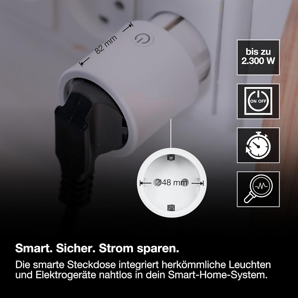 Intelligente Steckdose mit Energieverbrauchskontrolle und ZigBee-Technologie zur Einbindung von elektrischen Geräten ins Smart-Home-System. Produkteigenschaften: Steuerung über kompatibles Smart-Home-System oder Ein- / Aus-Taste am Gerät. Steuerung über Stimme möglich: Google Assistant oder Amazon Alexa, abhängig vom genutzten Smart Home System. Netzwerkprotokoll: ZigBee 3.0. Zeitplanung. Hohe Schaltleistung: bis zu 2.300 W / 10 A. Energiezähler. Für vollen Funktionsumfang Verbindung mit einem kompatiblen Smart Home System (Gateway und App) notwendig. Produktvorteile: Kleines Design, kompatibel mit allen Arten von Steckdosen und stört nicht die benachbarten Steckdosen. Integriert konventionelle Elektrogeräte in kompatible Smart-Home-Systeme. Ermöglicht das Schalten von herkömmlichen Leuchtmitteln und anderen elektrischen Geräten. Überwacht den Energieverbrauch der angeschlossenen Geräte und verfolgt den Energieverbrauch. Anwendungsgebiete: Wo immer nicht-smarte Geräte in ein kompatibles Smart-Home-System integriert werden sollen. Technische Ausstattung: Steuerung via App erfordert ein kompatibles Smart home System. Sicherheitshinweise: Geräte mit Wärmeentwicklung nach Benutzung vom Netz, d.h. vom SMART+ Plug, trennen, um versehentliches Einschalten zu vermeiden.. Sehr große kapazitive und induktive Lasten können in ungünstigen Fällen zur Zerstörung des Gerätes führen oder die Zahl der Schaltzyklen reduzieren.. Verwenden Sie den SMART+-Plug nicht in Verbindung mit medizinischen Geräten.. Anzuschließen an einen Sicherungsautomaten (für max. 10 A). Produkt der Schutzklasse I. Alle elektrisch leitfähigen, metallischen Gehäuseteile, die im Betrieb oder während der Wartung im Fehlerfall Spannung aufnehmen können, müssen durchgängig mit dem Schutzleiter verbunden sein.